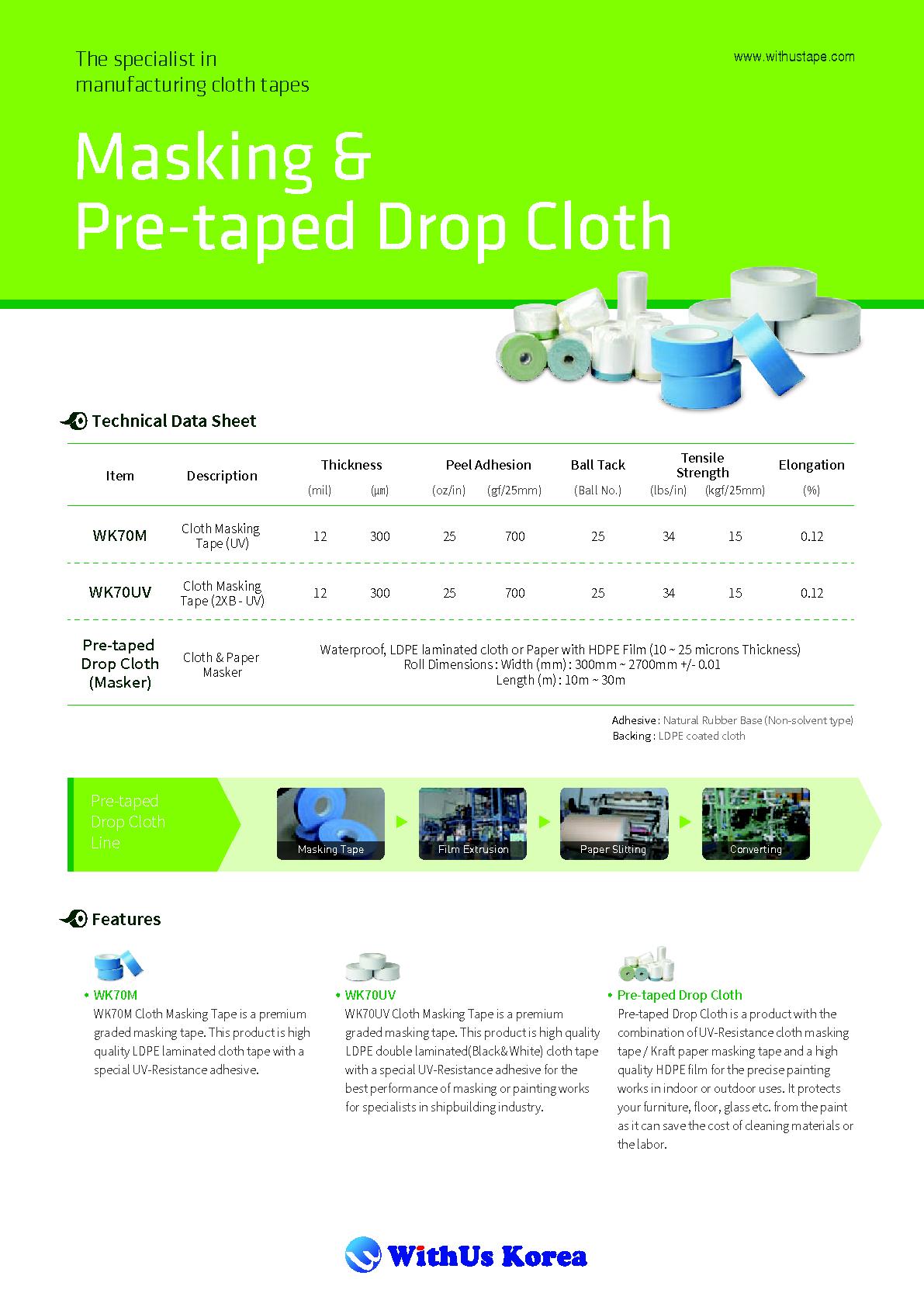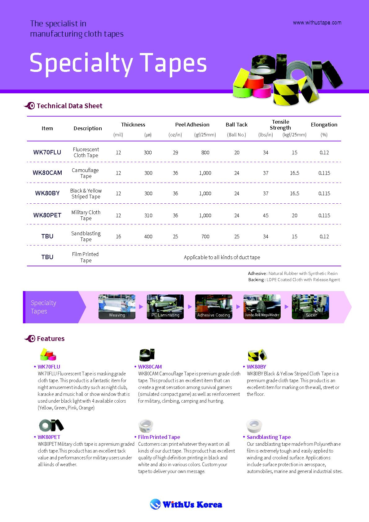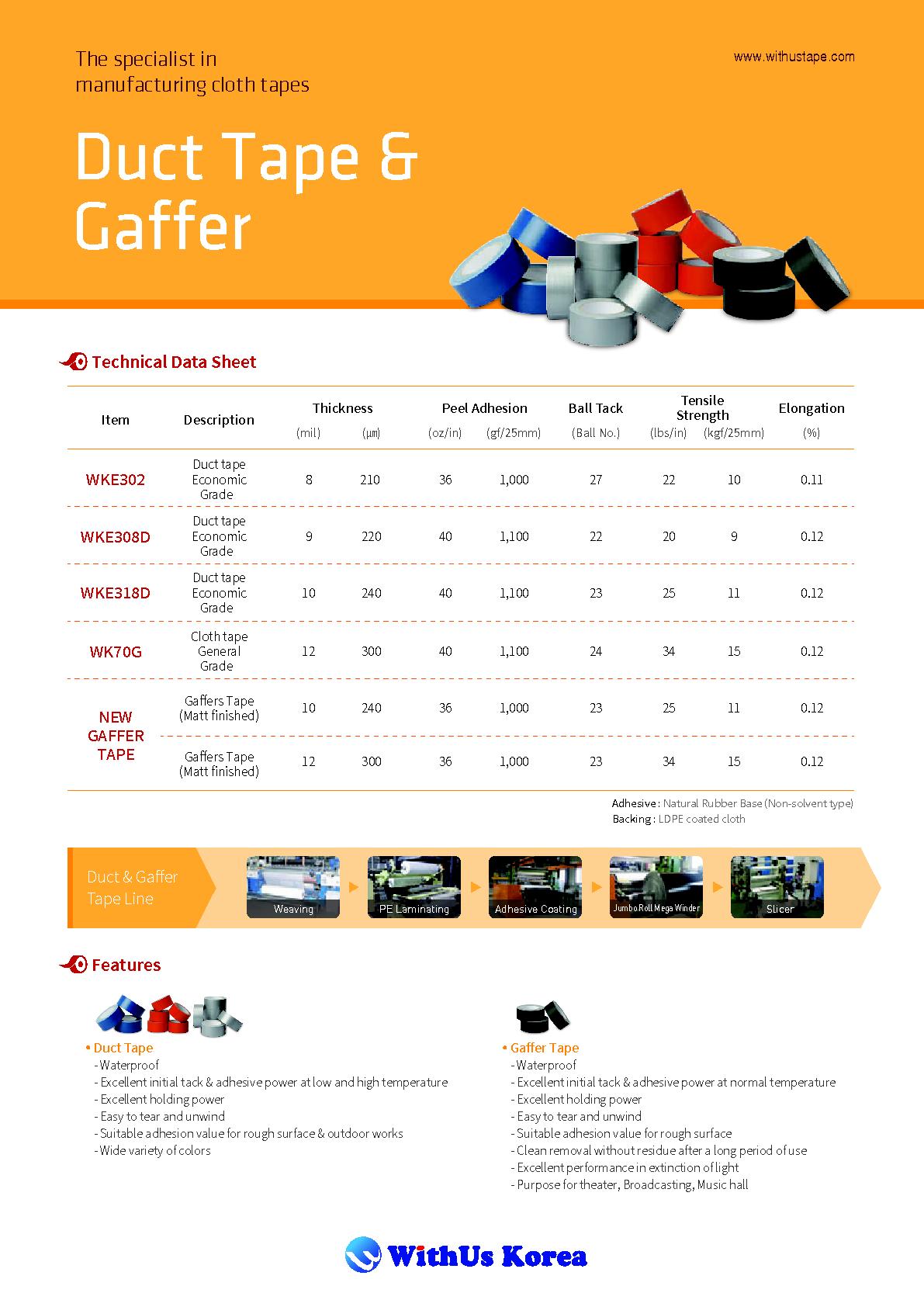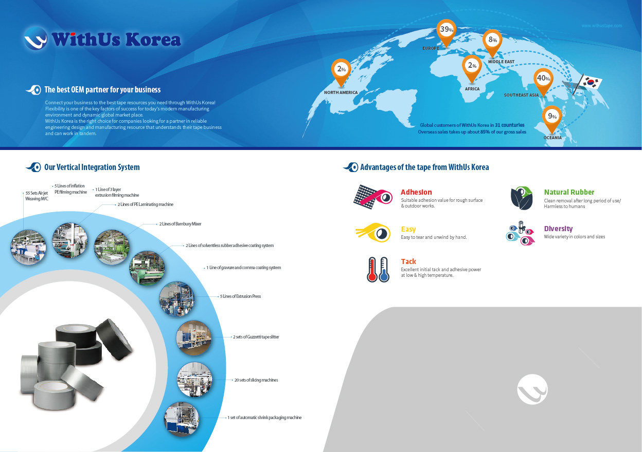 WithUs Korea Co., Ltd. has specialized in premium cloth adhesive tapes since 2006. Our portfolio includes duct tape, gaffer tape, masking tape, fluorescent and warning tapes, and heavy-duty premium cloth tapes, all made with LDPE-coated cloth and natural rubber adhesive. Unlike many competitors, we operate a vertically integrated production system, from cloth weaving and film coating to adhesive calendaring and slitting, ensuring consistent quality and fast response. With more than 90% of sales generated from exports, we partner with distributors and private brands across Europe and Southeast Asia, providing OEM solutions backed by competitive pricing and direct manufacturer service.